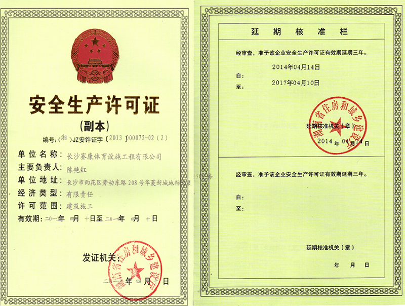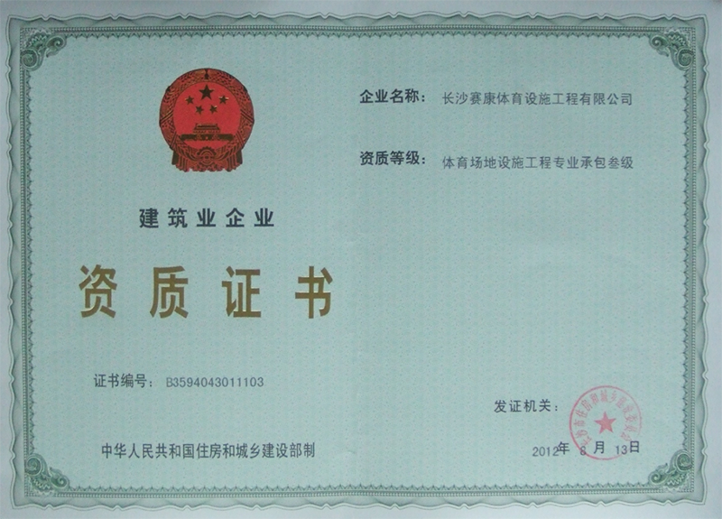 2011年长沙康赛普实业有限公司根据市场需要,提高服务标准, 专门成立一家专业体育设施安装公司-长沙赛康体育设施工程有限公司, 并于2012获得国家建设部颁发“体育场地设施施工三级资质”和“安全 生产许可证”。